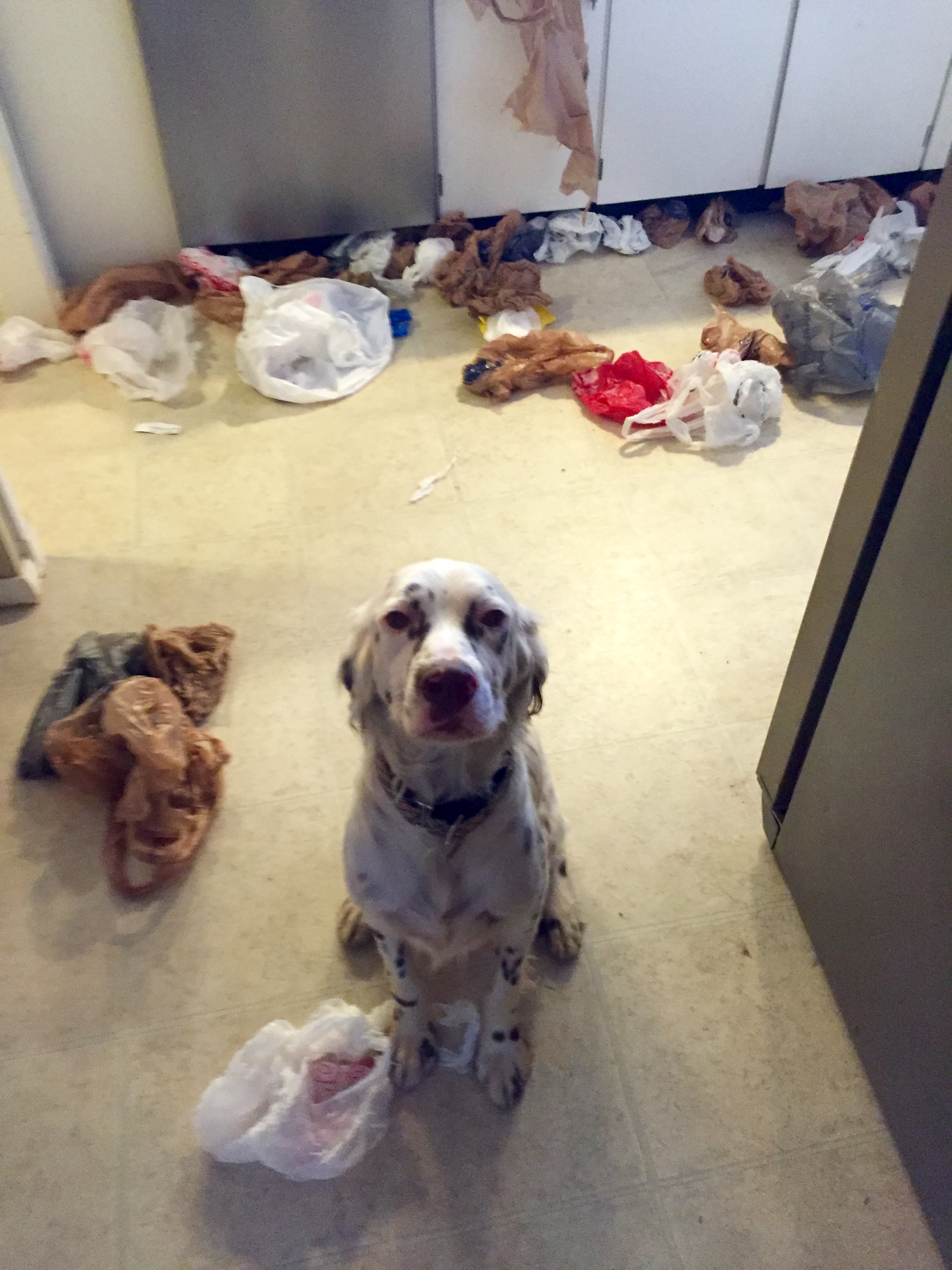 I was told he was 3-4 years old, but I’ve since verified with the breeder that he was born in July 2014. This explains why he has been a bit more unruly and destructive than I was expecting. He’s extremely agile and able to completely jump onto my desk and kitchen table – with all 4 feet! I see an agility class in his future. As you can see, he had some fun with plastic bags and with one of my ottomans when I wasn’t home. Luckily I regard these things as potentially par for the course when getting a new dog, and he’s too cute to stay mad at him for long. I’ve blocked off access to the living room for now, and since then everything has been fine. I feel it’s important to mention that his behavior is purely due to him being a puppy who never had a stable home or learned proper manners, and is totally unrelated to his deafness.
