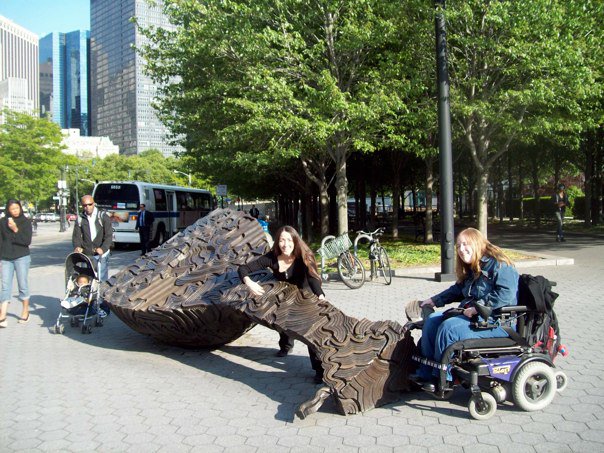 On my second day in NYC, we spent a few hours in Central Park, then decided to take the subway to fulfill the wish I’d made three months ago – seeing the Statue of Liberty. I was accompanied by my assistant, Tamra, and Glenn. We planned ahead and checked for accessible stops, and it appeared that the one closest to the Statue of Liberty would work. Aside from the expected elevator of questionable cleanliness, getting down to the subway platform was no problem. However, there was a large gap between the subway car and the platform, with a 2 inch step to surmount. It took two people to get me in the car, all the while worrying that the doors would shut on us. After changing trains and going through the same process again, we finally got to our stop, only to find out that it was closed for repairs. We had to go almost back to where we started, and take a bus instead.